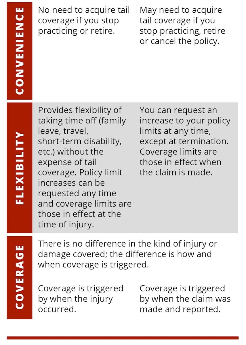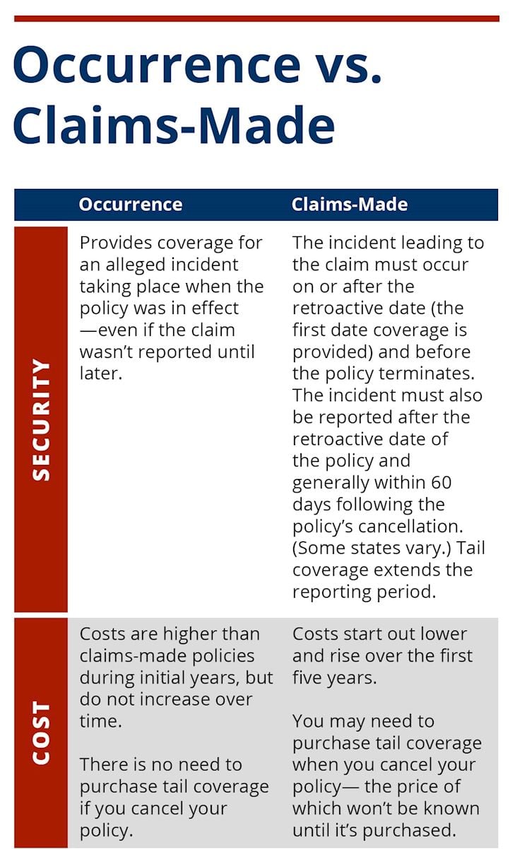 There are two basic types of malpractice insurance: occurrence and claims-made. When you are deciding between the two, it is important to evaluate your individual circumstances not only now, but also in the future.
